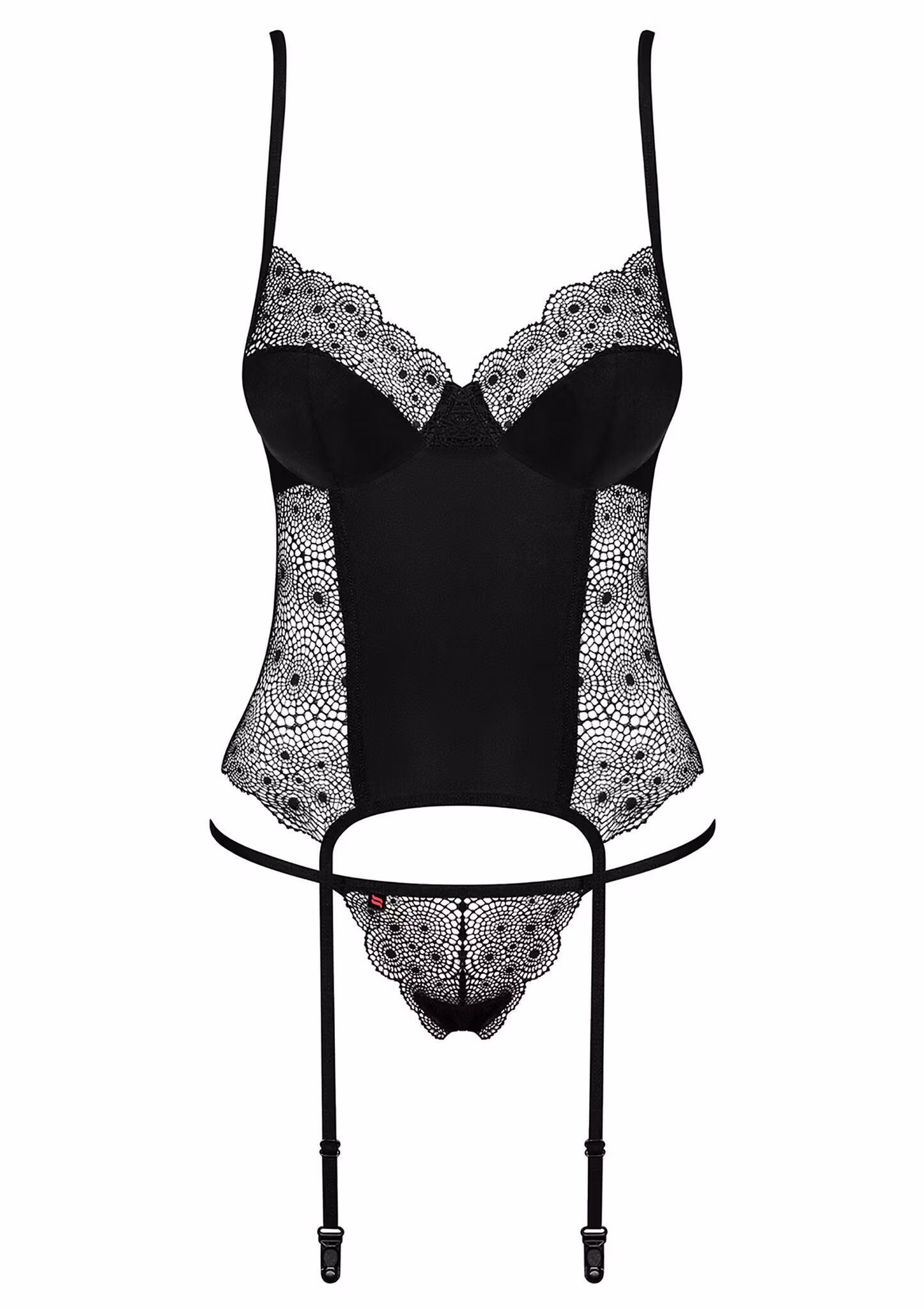 Sharlotte is an extremely feminine, eye-catching corset. We created it especially for you! Thanks to the combination of classic black with a very original lace pattern, you can’t pass by it indifferently. And we have added a lovely matching thong to the set. Lace on the bust, belly side, and back as well as the characteristic lacing on the back – these details will make you feel even more special. Ready for Obsessive moments for two?