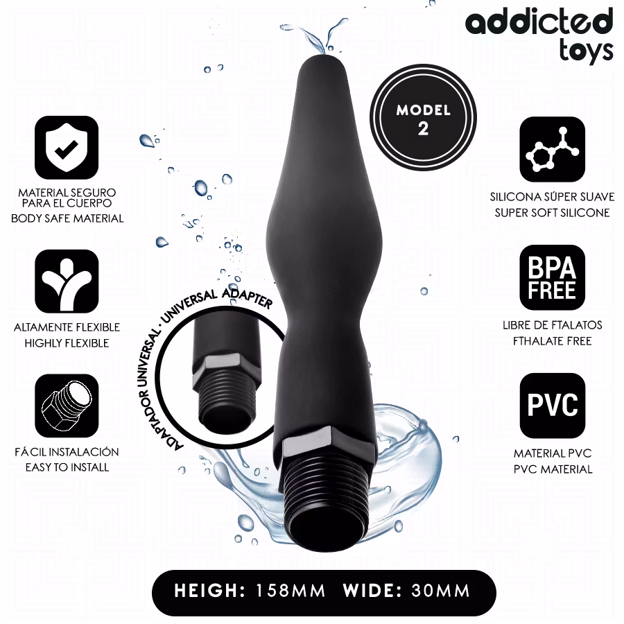 Explore without limits with the right preparation. Intimate hygiene is key to enjoying your anal experiences to the fullest, and with the Addicted Toys anal cleaner, you'll get a deep, safe, and hassle-free clean. This Model 2, part of a range of 6 different designs, is designed to be comfortable, soft, and effective as part of your daily or pre-play intimate routine. Made with premium materials like flexible PVC and super-soft silicone, this accessory is completely body-safe and phthalate-free, meeting high hygiene standards. Thanks to its universal adapter, it is compatible with most shower systems, making it easy to install in seconds and ensuring practical, hassle-free use.