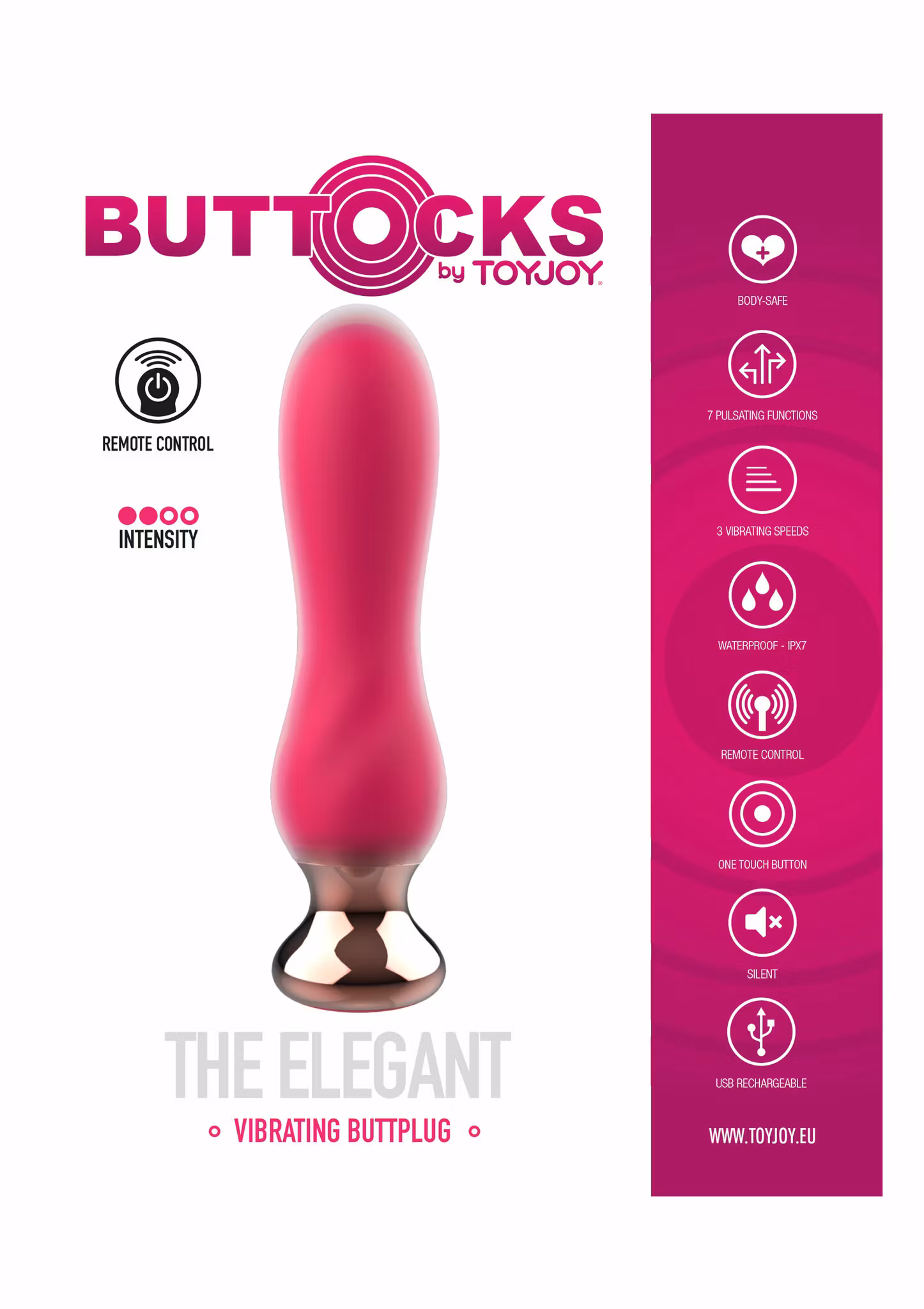 The Elegant is a vibrating, frosty pink butt plug and features a powerful motor with 7 different vibrations modes and 3 vibrating speeds. Each mode offers deep rumbling vibrations, which are easily controlled on the item or with the included remote control. Buttocks by TOYJOY is a premium line of high-performance butt plugs, created with a variety of special features to boost your anal pleasure. Buttocks by TOYJOY is the perfect choice for next-level anal stimulation.