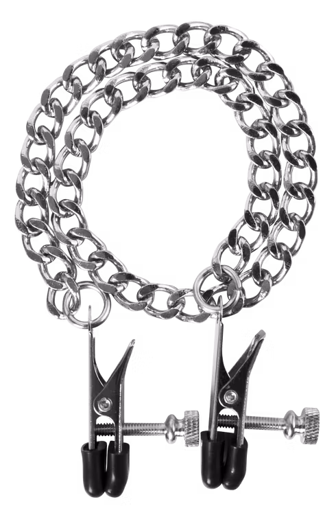 Flat nipple screw 149 kr Produkten finns för tillfället inte i lager. Dela Information Set of two adjustable nipple clamps.From the Guilty Pleasure BDSM collection.The squeezers are made of metal and have PVC covers at the flat tips and handles.The pressure on the nipples can be easily adjusted with the screws, for ultimate squeeze control.The metal chain between the squeezers adds extra weight.Size of the clamps: 4 cm / 1.5 inch.Size40.6cm