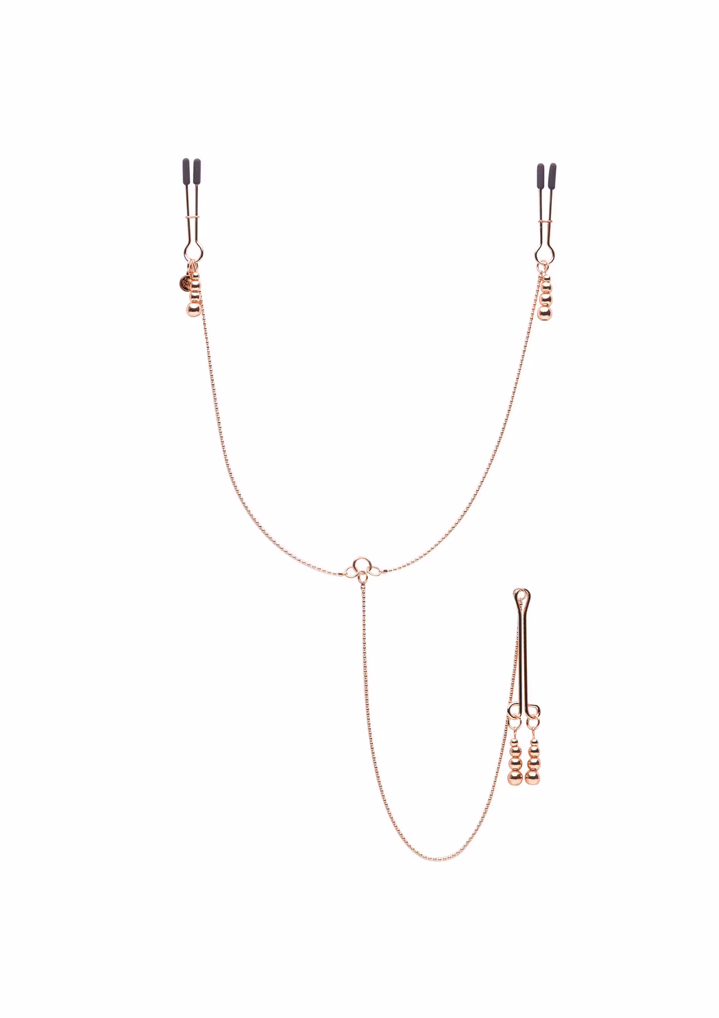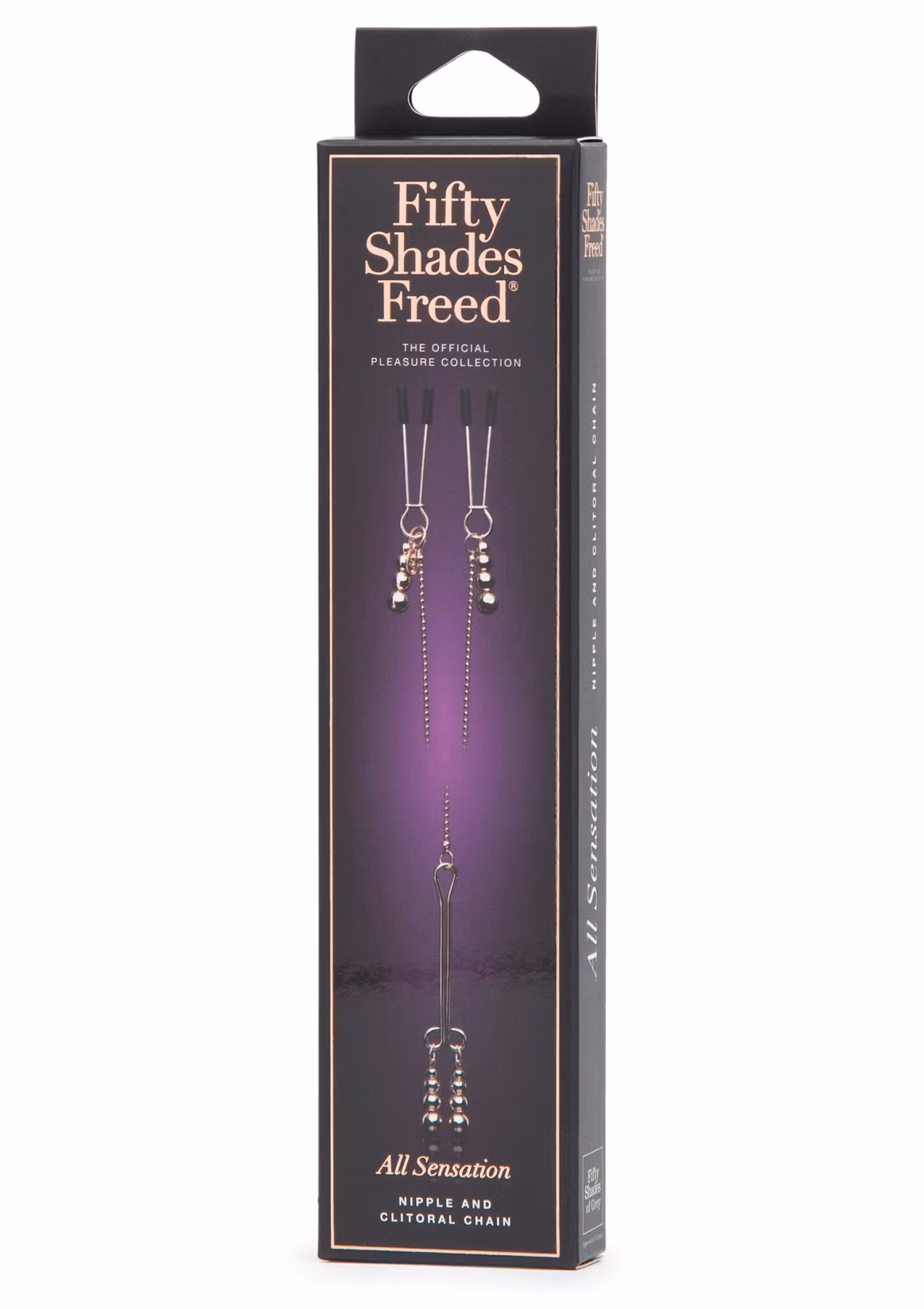 Look and feel divine with the ultimate erotic fashion statement that is this beautiful nipple and clitoral chain. Discover the thrill of sensation which occupies a sweet place between pleasure and pain, and enjoy a new level of sensory play and excitement. "I am all sensation, everywhere – a sweet, sweet agony..." – Anastasia Steele Use the adjustable, silicone-tipped nipple clamps and the slide-to-fit clitoral clamp to apply exquisite pinch and pressure to your most sensitive spots. With increased sensitivity and boosted arousal, your intimate zones will become even more receptive to further stimulation in the form of touches, strokes, licks and kisses. Includes a luxury storage bag. Use with water-based lubricant to heighten sensation in play. Part of the Fifty Shades Freed The Official Pleasure Collection approved by author E L James.