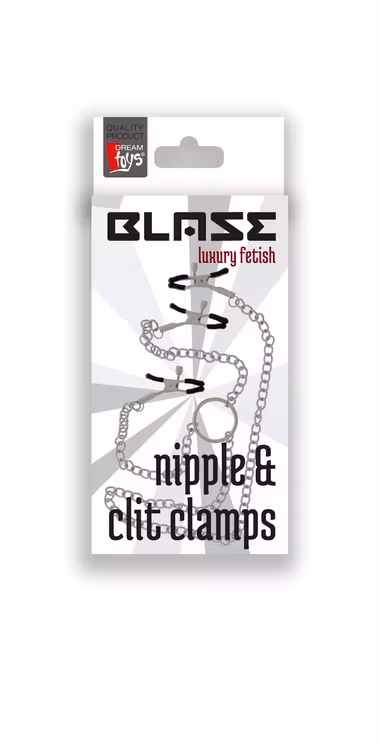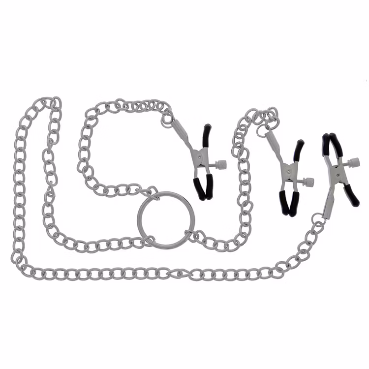 A set of metal nipple clamps, each on a 20 cm long metal chain, and an attached clitoris clamp on a 34 cm long metal chain. The clamps have PVC covers to protect the skin. Pressure can be adjusted with the screws, for ultimate squeeze control.
