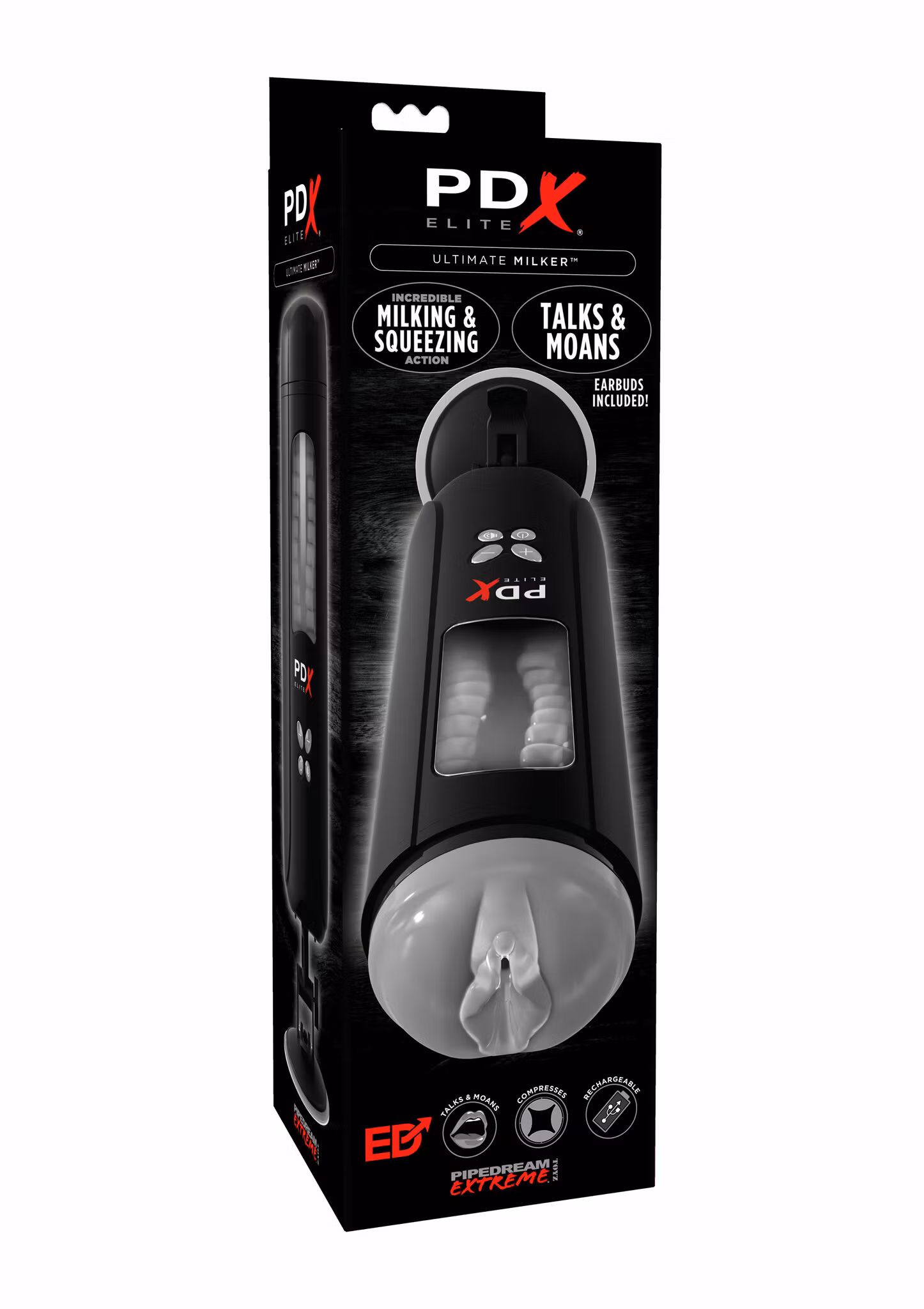 Introducing first-of-its-kind milker masturbation technology designed to fully surround your shaft with squeezing, gyratory stimulation for the ultimate self-pleasure experience! A transparent window allows you to view the action as every inch of your cock is milked over and over by 10 revolving, gyrating functions, plus 5 active speed levels, all powered by a convenient rechargeable motor. The internal multi-ribbed TPE sleeve is lined with incredibly satisfying textures to enhance rotational pleasure and features a closed-end to further intensify natural suction. To enjoy fully automated rotational masturbation, simply press the button to initiate active milking power. Sexy, breathy moans can also be activated for intensified erotic excitement! Explore your options! The sturdy exterior case with an adjustable, locking suction cup can be set to your preferred hands-free position, or remove the interior TPE sleeve for handheld pleasure. Rotational Milker Masturbation Technology - Advanced technology allows for ultimate spiraling, milking stimulation.Personalize Your Power - Explore 10 revolving functions plus 5 active speed levels.High-powered Motor - The ultra-strong motor provides powerful, pleasing revolutions.Sexy Moans - Heighten your masturbation experience with breathy moans of pleasure via the FREE included earbuds. Locking Storage Cap - Keeps the TPE sleeve snugly protected for optimum storage.Removeable Soft & Stretchy Sleeve - The super-stretchy and soft sleeve features a supple vagina and is lined with rows and rows of stimulating pleasure nubs. Pleasantly warms to your body temperature and is removable for solo fun and easy cleaning.Transparent Window - The clear, durable window allows you to watch yourself enjoy the best masturbation experience every time! USB Rechargeable - Ready when you are! Easily and conveniently rechargeable with included charging cord, offering hours of enjoyment.Removeable & Adjustable Locking Suction Cup - Intensely powerful suction cup allows attachment to sick to almost every flat surface with an innovative twisting lock design for an extra strength connection.Erectile Dysfunction Aid - Regular masturbation strengthens pelvic floor muscles, helping to prevent erectile dysfunction (ED) in men. Edging, the practice of purposely delaying orgasm, can build sexual stamina and can help with ED by encouraging healthy blood flow to the penis. Care Instructions: Rechargeable via the included USB cord. The sleeve is removable for easy cleaning. Cleanup is a snap after the fun with Refresh Toy Cleaner and warm water. Do not submerge the PDX Elite Ultimate Milker in water. If desired, use a water-based lotion like Moist with this product. Quick Start Guide: ON/OFF - Press the power button for 3 seconds to initiate power. Press and hold the power button for 3 seconds to turn OFF. Milker Masturbation - To control milking masturbation, press the power button again to cycle through 10 functions of gyratory stimulation. Increase/Decrease Speed - Press the +/- buttons to cycle through 5 intensity levels of speed. Activate Sound - Press the speaker button to initiate sexy moans once jack-pin headphones are plugged into the Ultimate Milker’s base. (Headphones are included.)