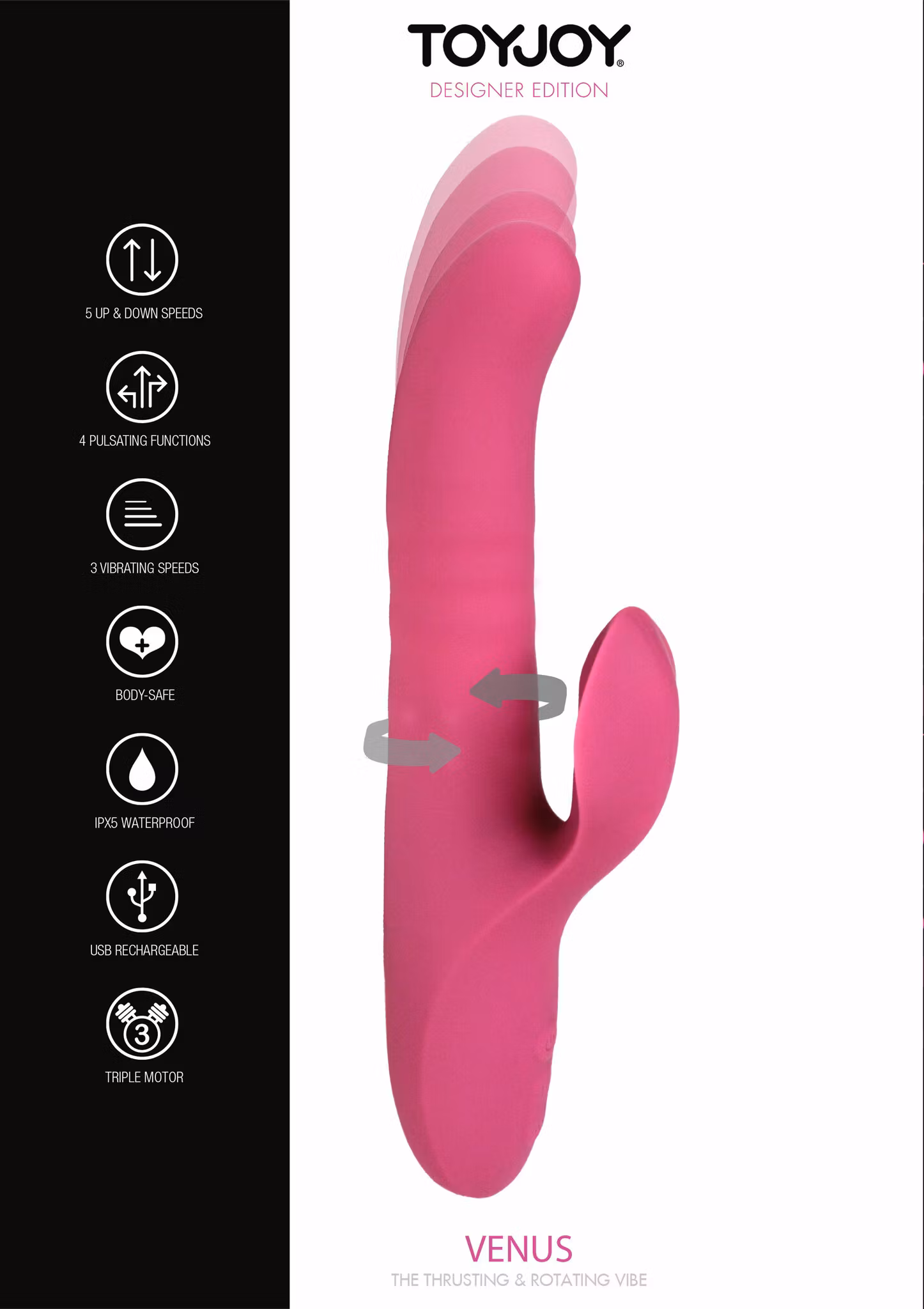 Experience the incredible pleasure of Venus, the thrusting and rotating vibrator from the TOYJOY Designer Edition collection. With its supreme up-and-down movement, Venus delivers deep thrusting pleasure like never before. Equipped with a triple motor system, this vibrator ensures powerful and intense stimulation. Enjoy the versatility of multispeed vibrations and indulge in the added stimulation provided by the rotating beads in the shaft. Venus is your ticket to unparalleled pleasure and unforgettable sensations.