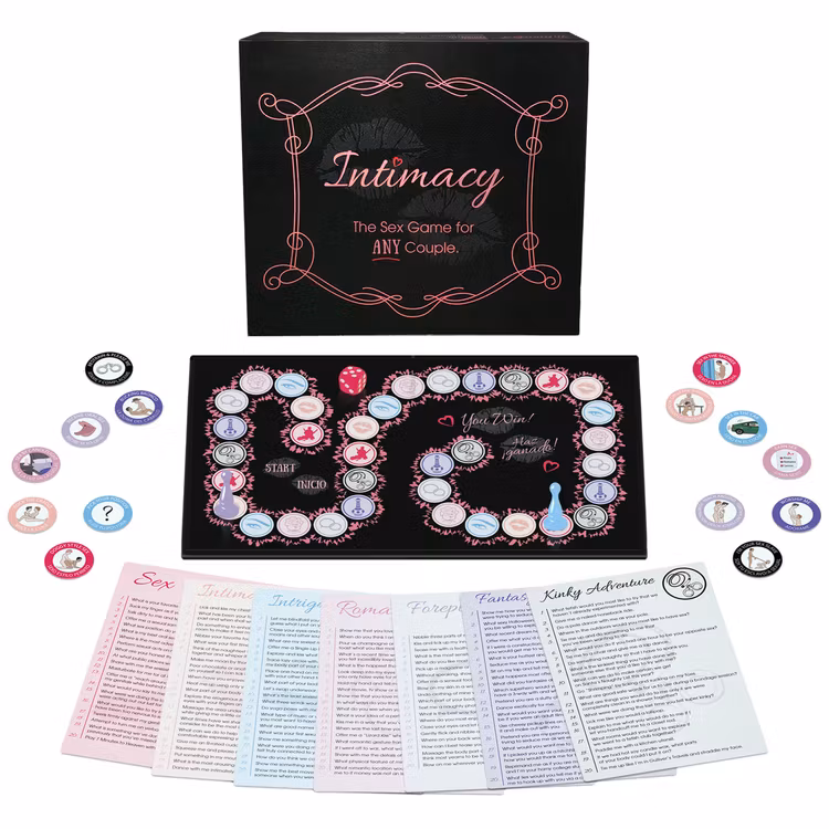 Brädspelet där du svarar på intima frågor och utför erotiska aktiviteter med din partner medan du flyttar runt på ett spelbräde. Utforska sju kategorier med sexiga äventyr, medan du samtidigt tjänar sexuella belöningar. Vinnaren får välja ett reward coin med spännande lekar, men den andra spelaren väljer vilken av de två sidorna ni ska utföra. Intimacy är ett könsneutralt spel.