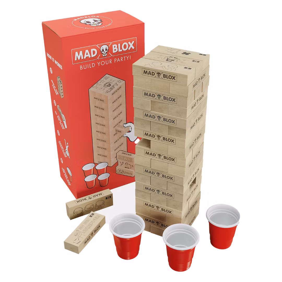 MadBlox is an exciting party game that combines skill, luck, and fun challenges! Each block you pull has a unique task for you or the whole group. Refuse a challenge? Take a shot! As the tower builds, so does the suspense, making each round crazier. Perfect for a night of laughs, surprises, and unforgettable memories with friends.